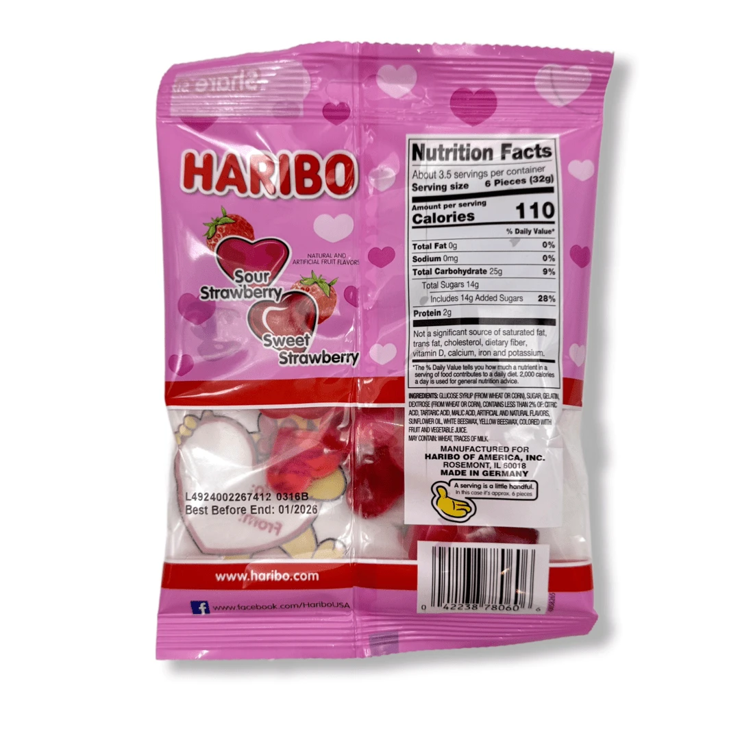 Love has never been so delicious! Haribo Valentine’s Sweet and Sour Hearts are here to make your candy dreams come true with the perfect pairing of tangy zing and luscious sweetness. Shaped like charming red hearts, these gummies pack a fresh burst of strawberry flavor that will make your taste buds dance with joy.